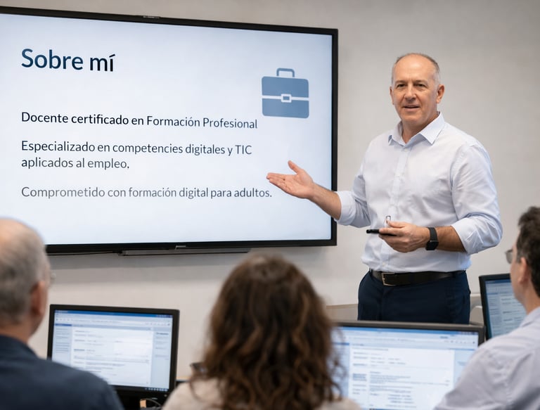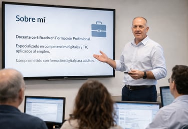 Soy docente certificado en Formación Profesional para el Empleo (SSCE0110), especializado en competencias digitales y herramientas tecnológicas aplicadas al entorno profesional.